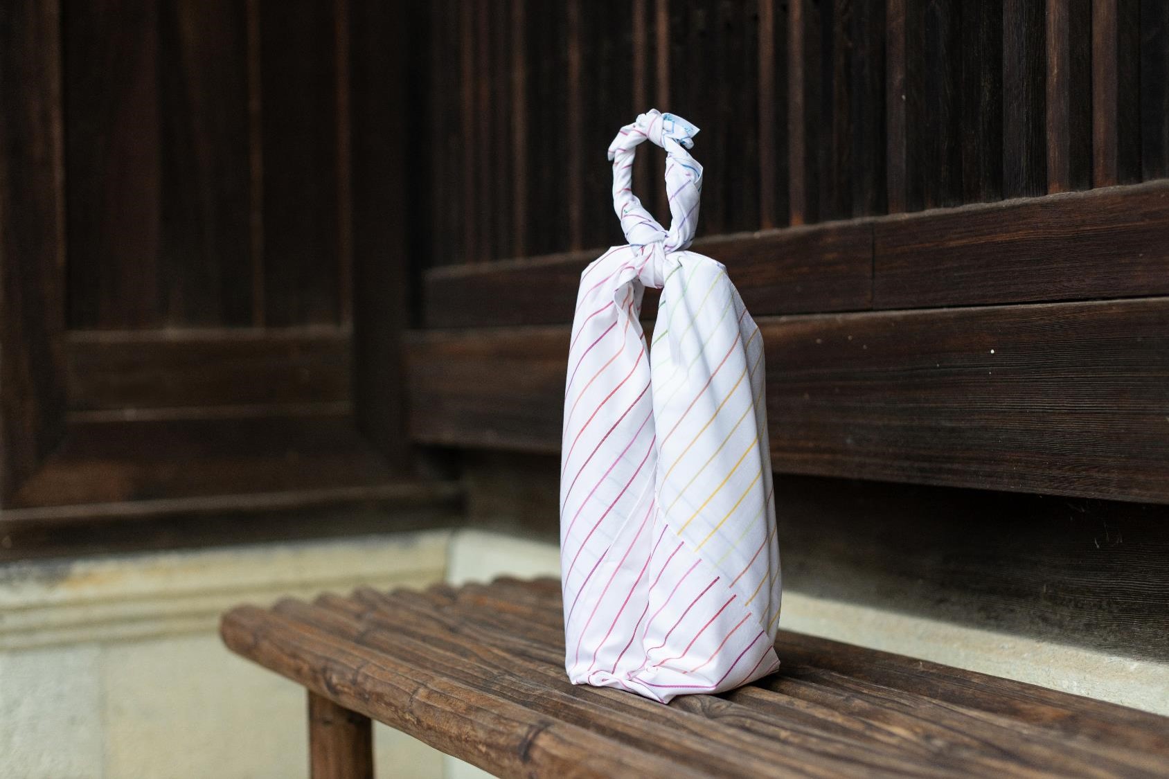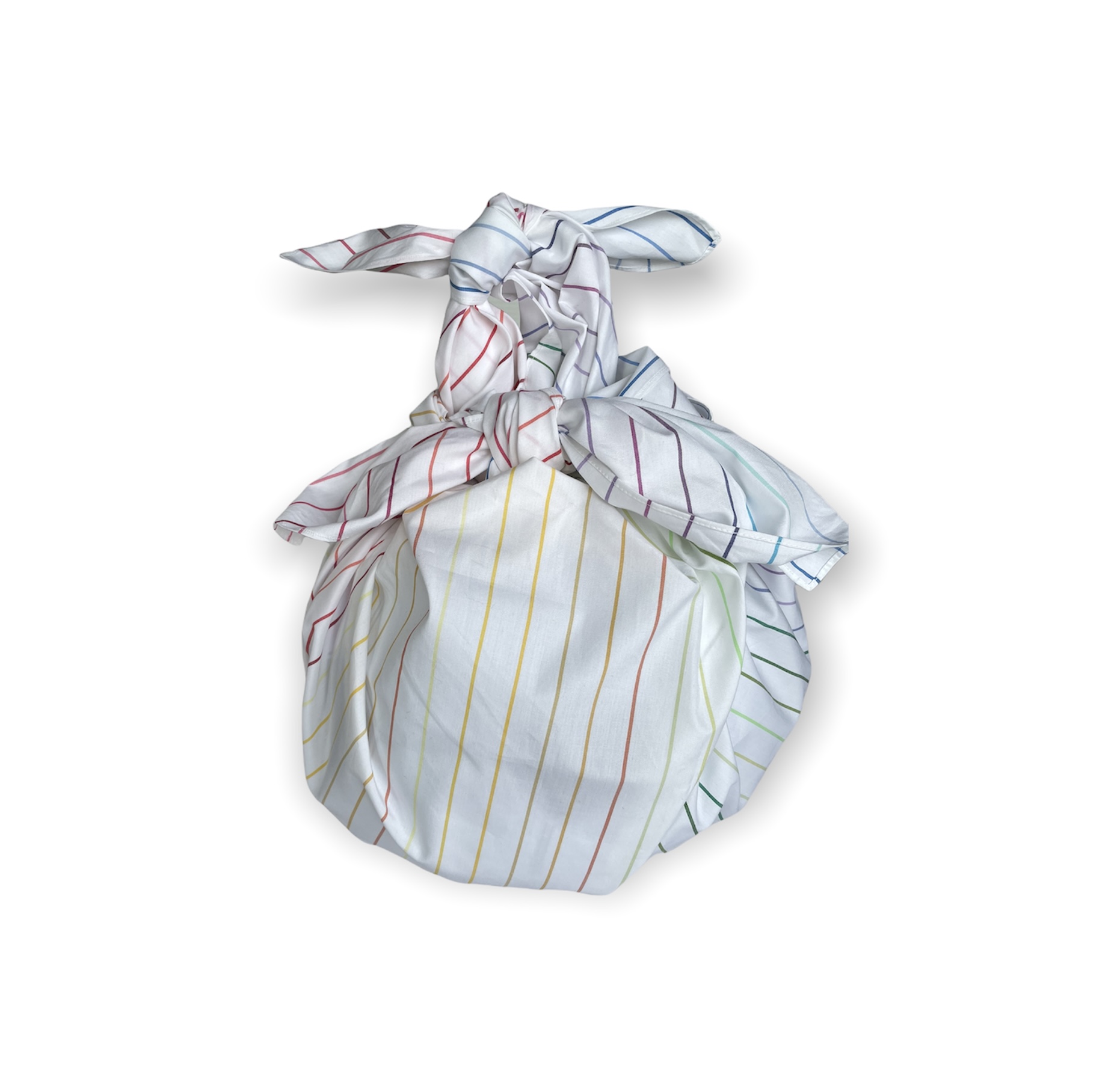 ホワイトベースにレインボーカラーのラインが入った大きなストライプ柄のふろしきです。