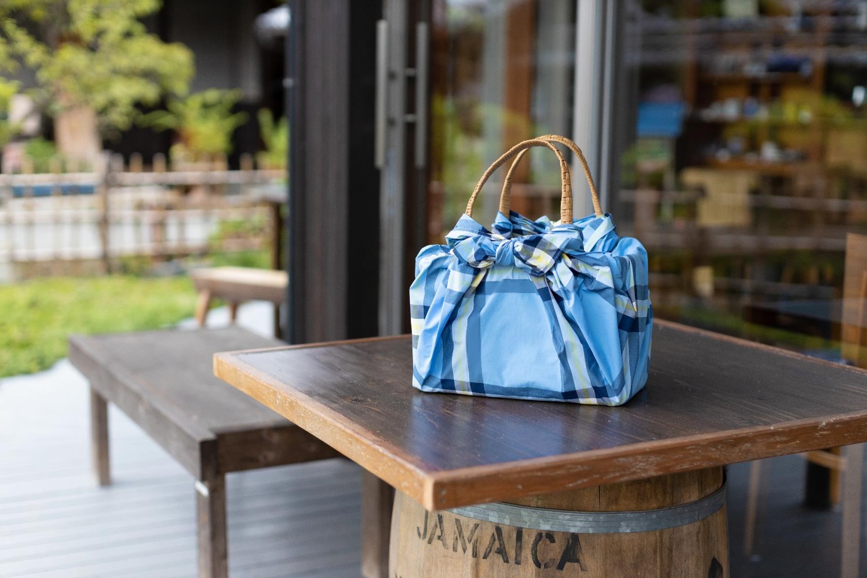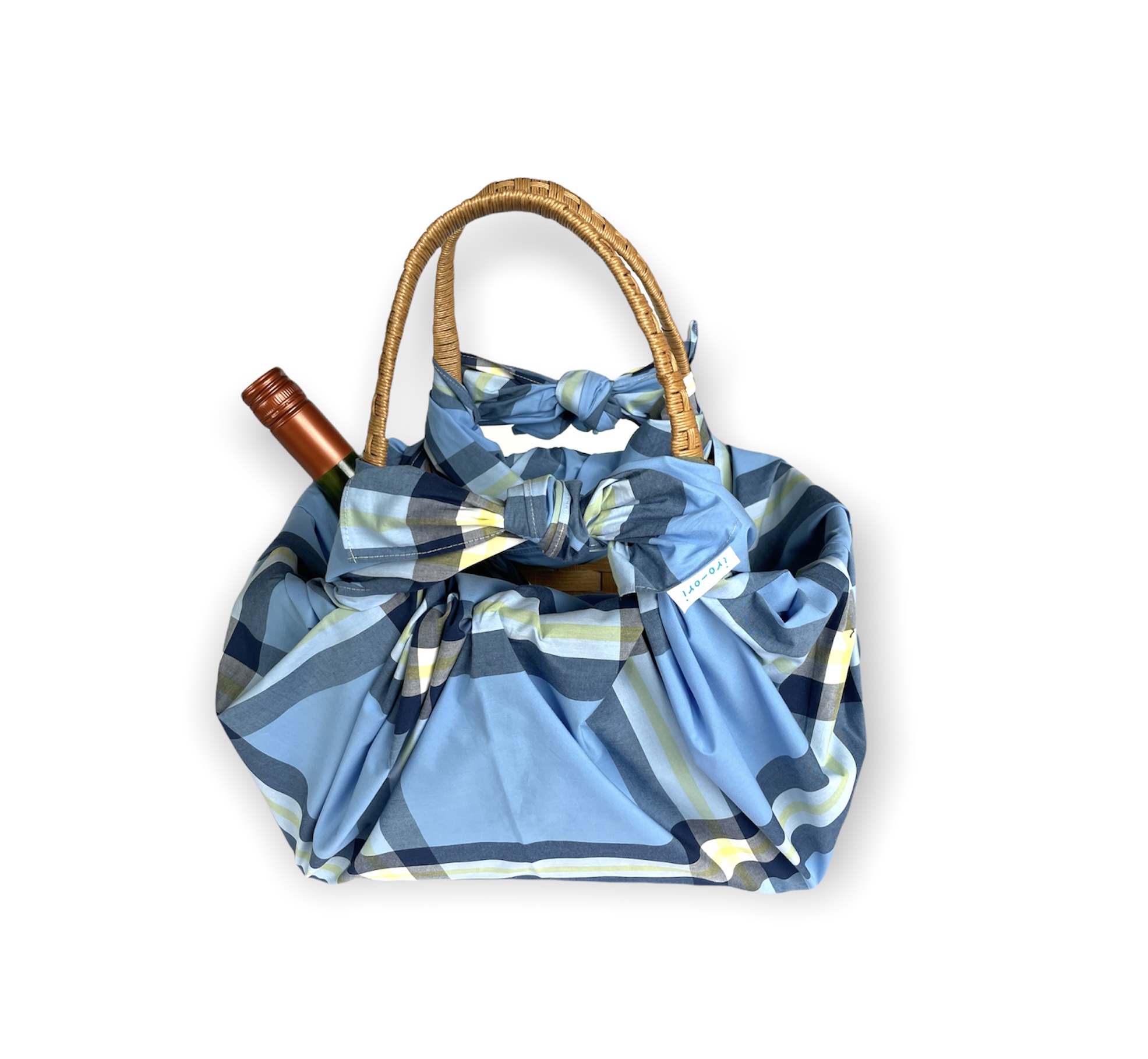 爽やかなスカイブルーにイエローのラインが映えるふろしきになります。
