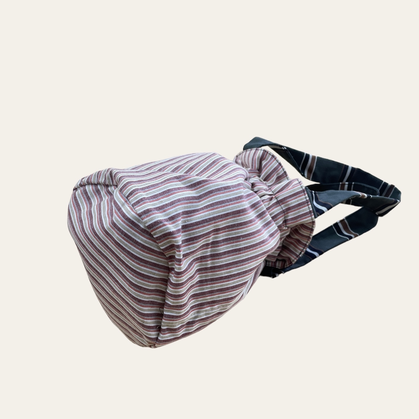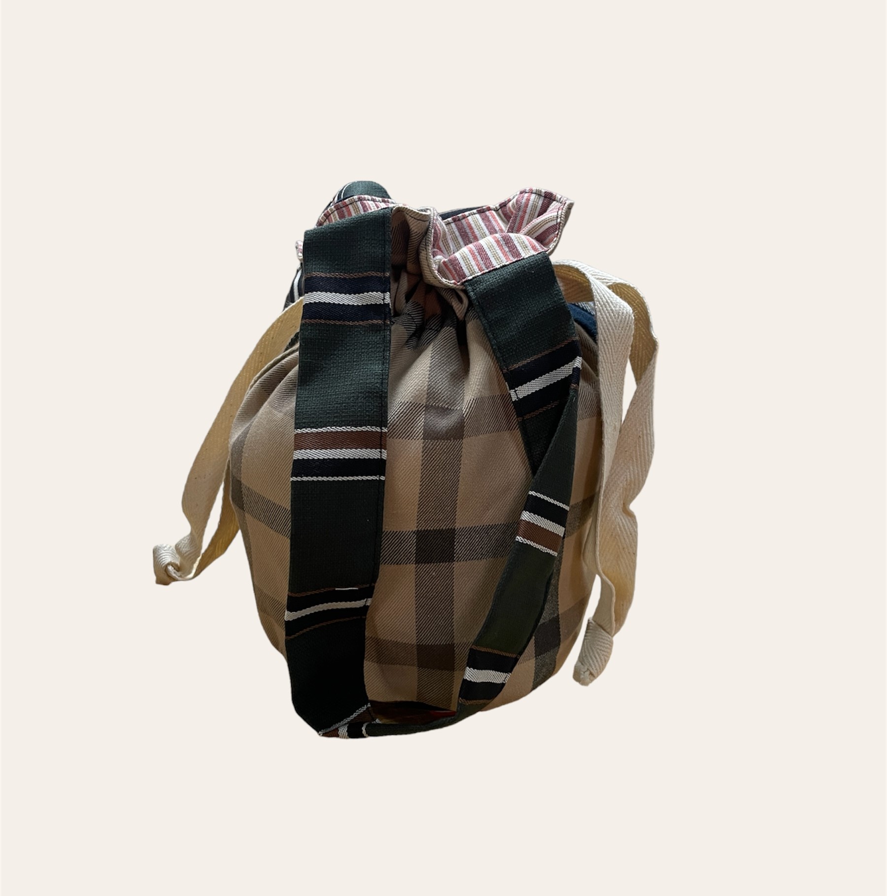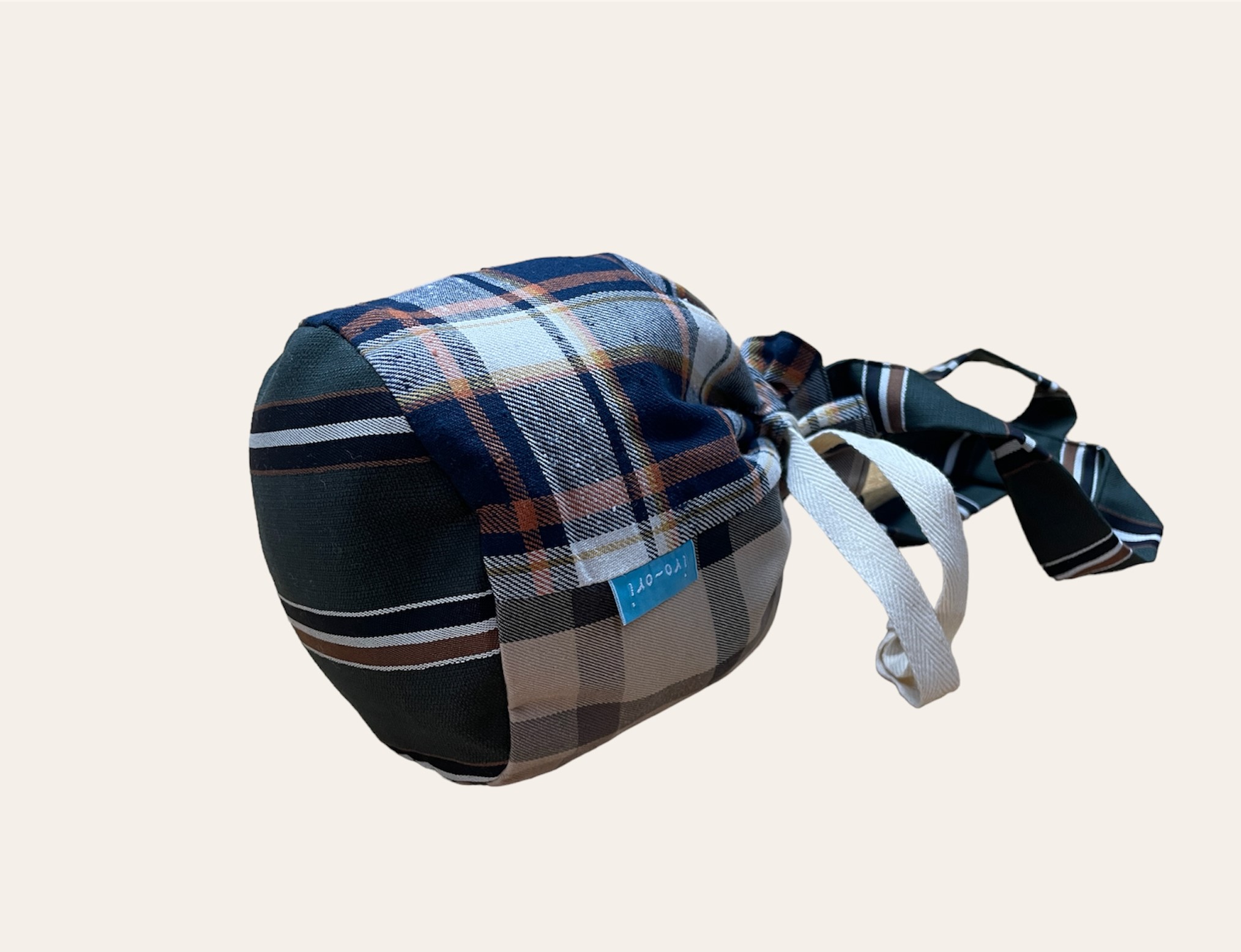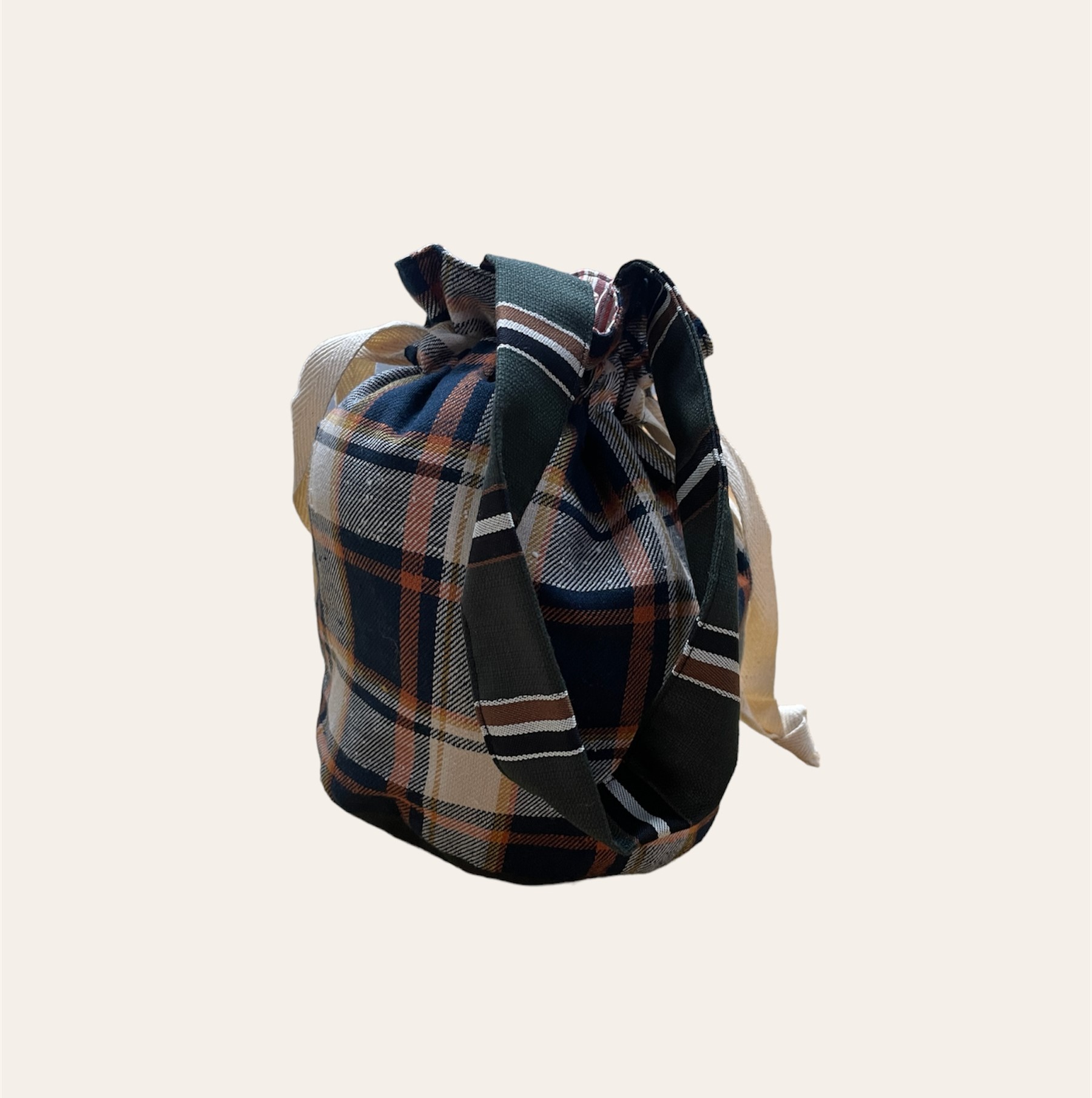 こちらの巾着は、表面の生地にベージュチェック柄、ネイビー×オレンジチェック柄、カーキ×ホワイトボーダー柄を使用。内面にレッド×ホワイトストライプ柄を使用。