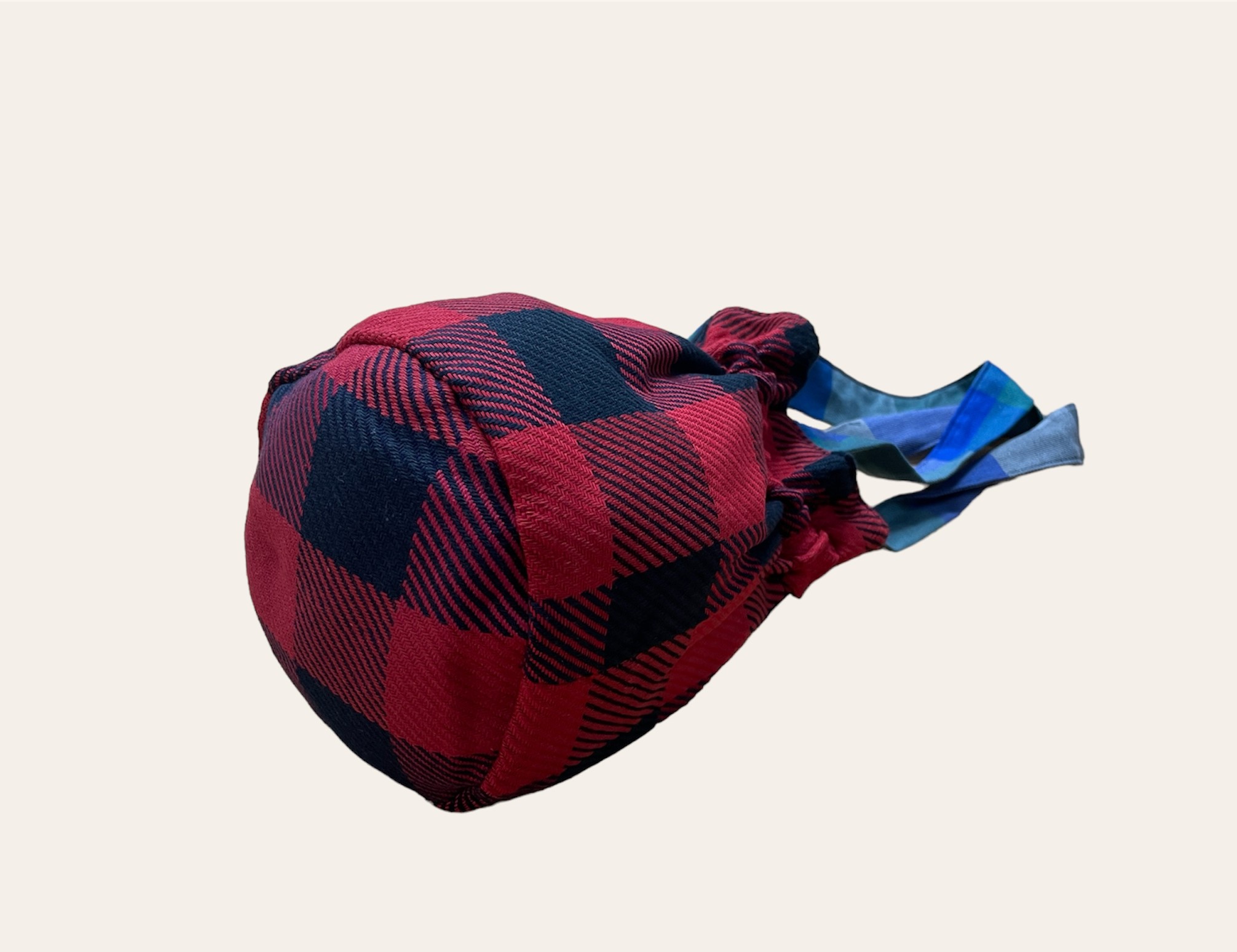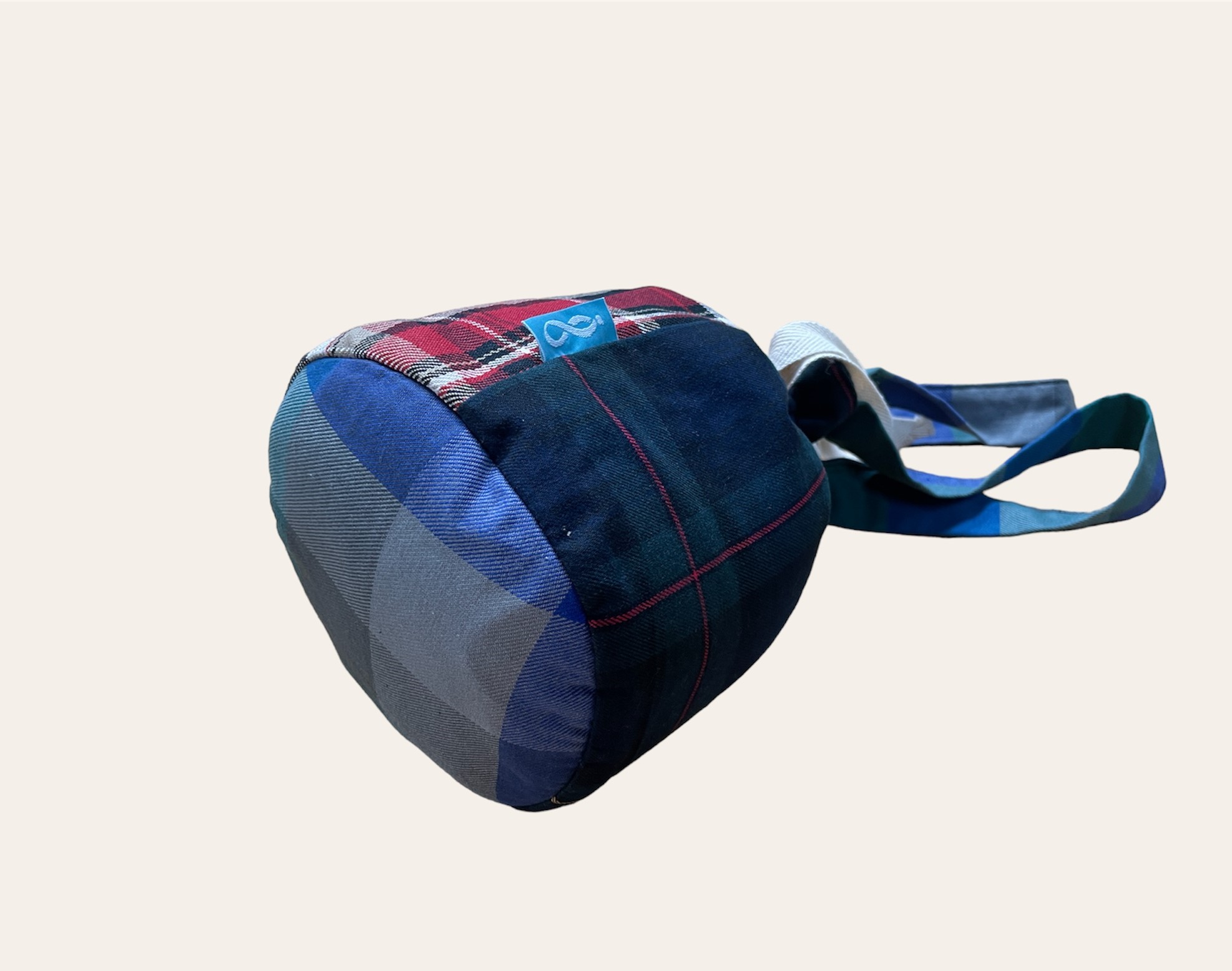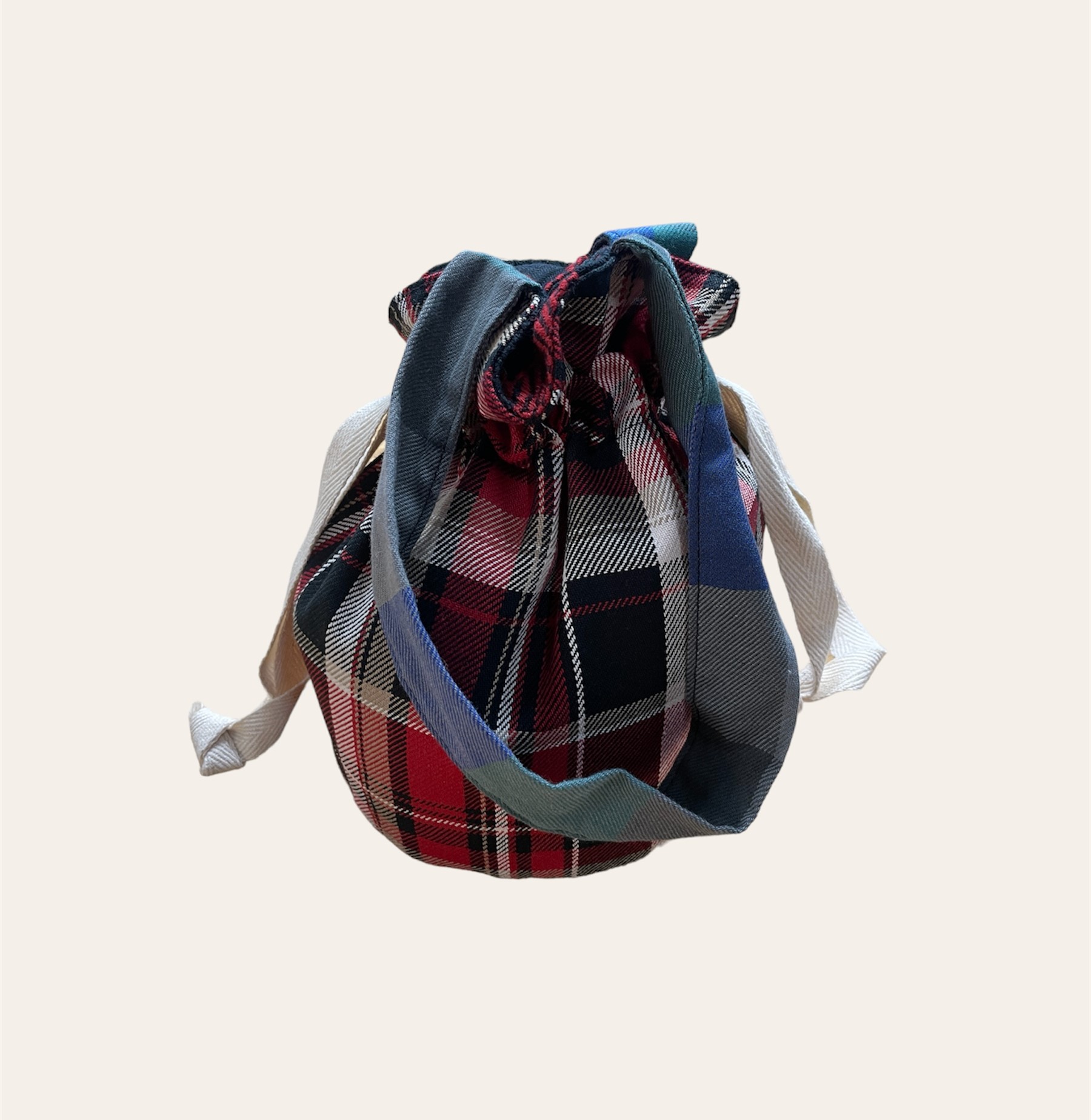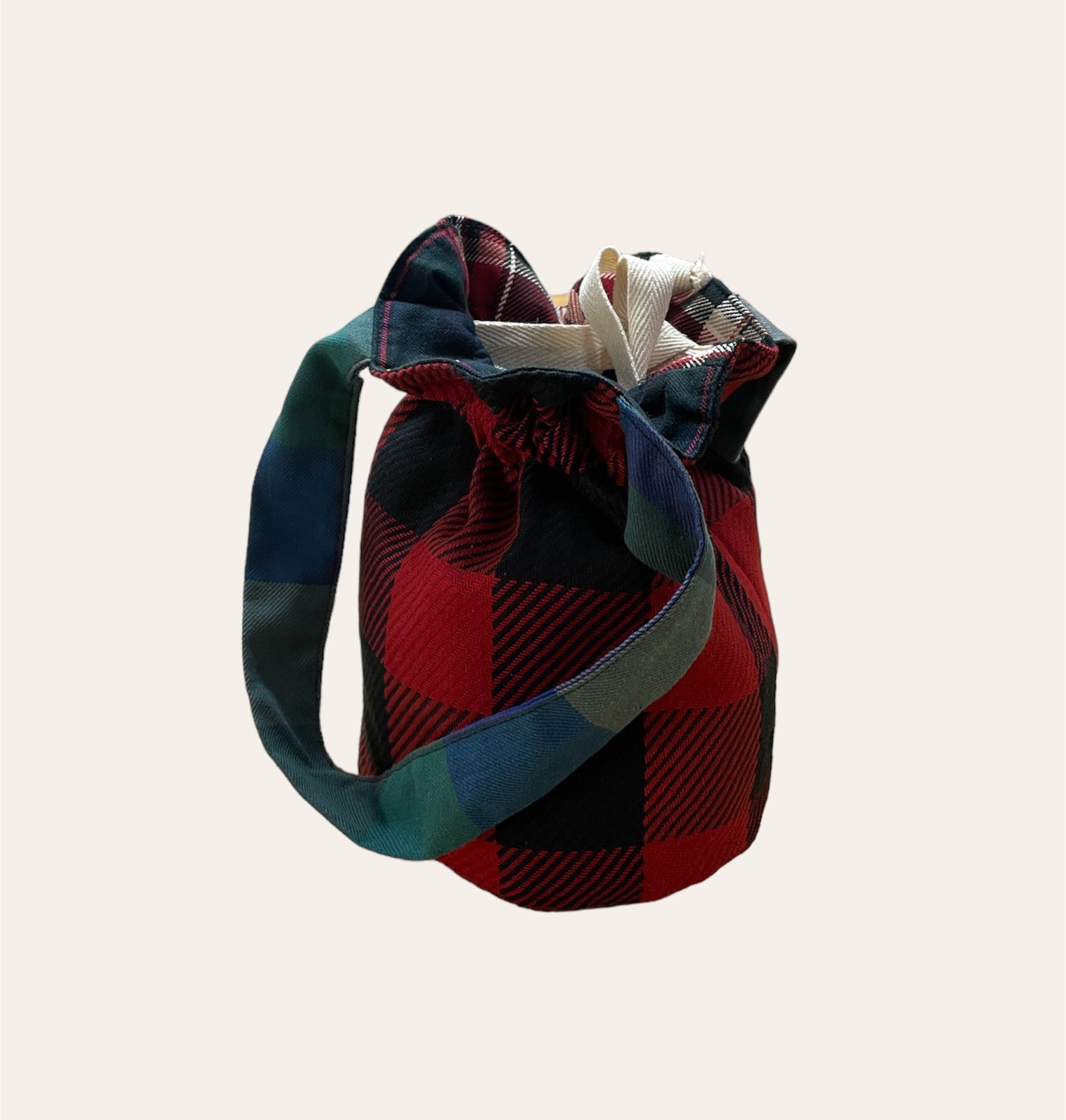 こちらの巾着は、表面の生地にレッドチェック柄、グリーンチェック柄。底面と持ち手はグリーン×ブルーチェック柄を使用。内面にブラック×レッドチェック柄を使用。