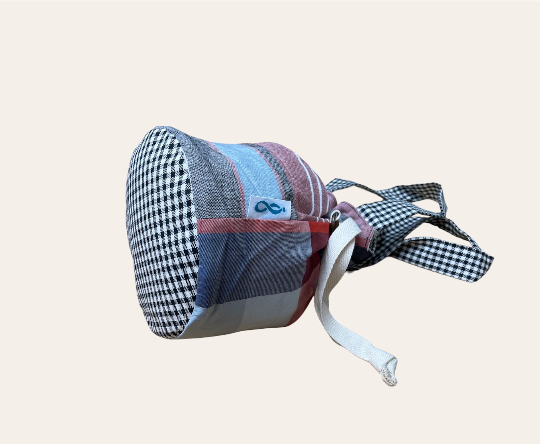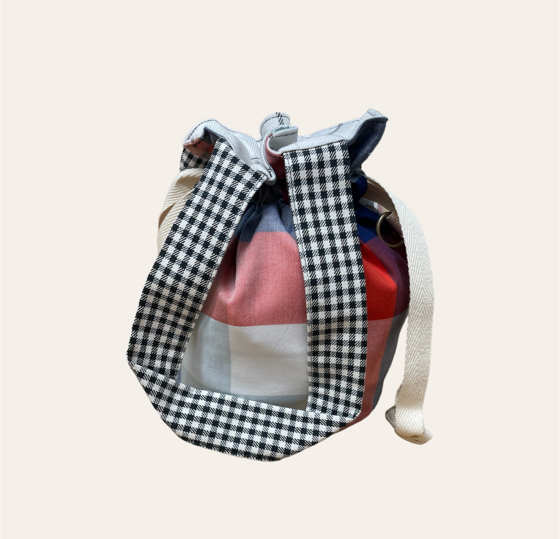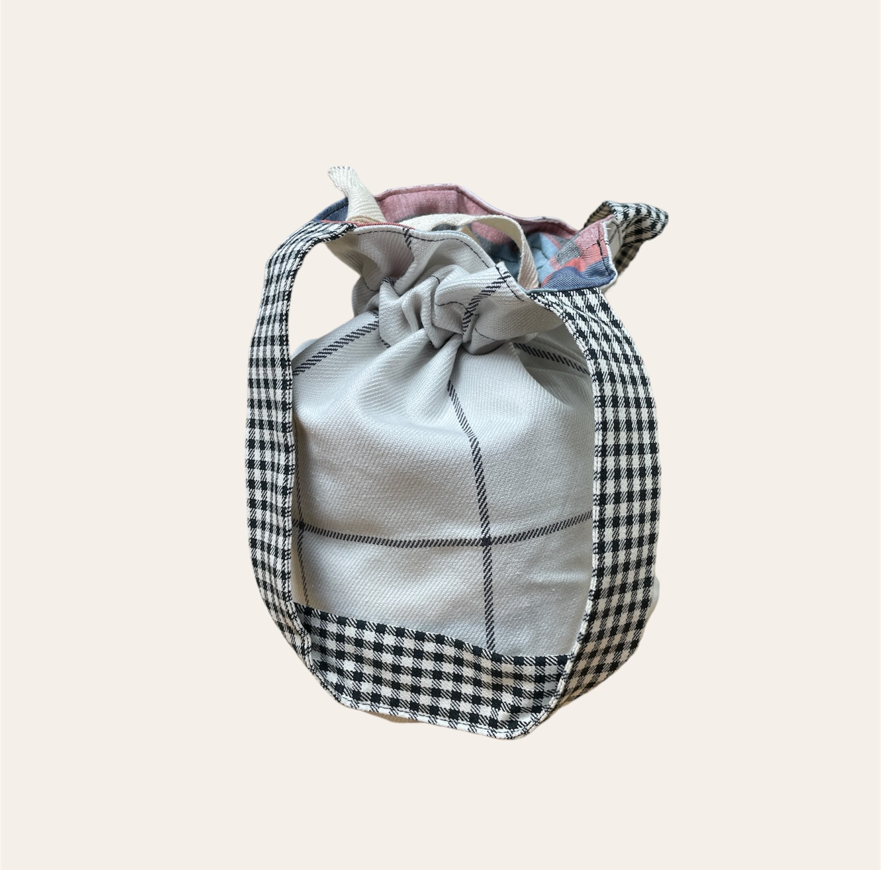 こちらの巾着は、表面の生地にレッド×ブルー系のブロックチェック柄、レッド系のボーダー柄。底面と持ち手はブラック×ホワイトの細かいチェック柄を使用。内面に白地にブラックのチェック柄を使用。