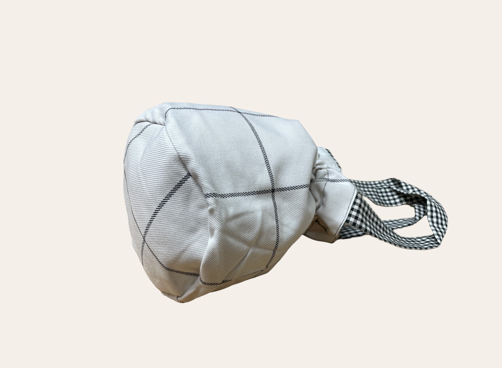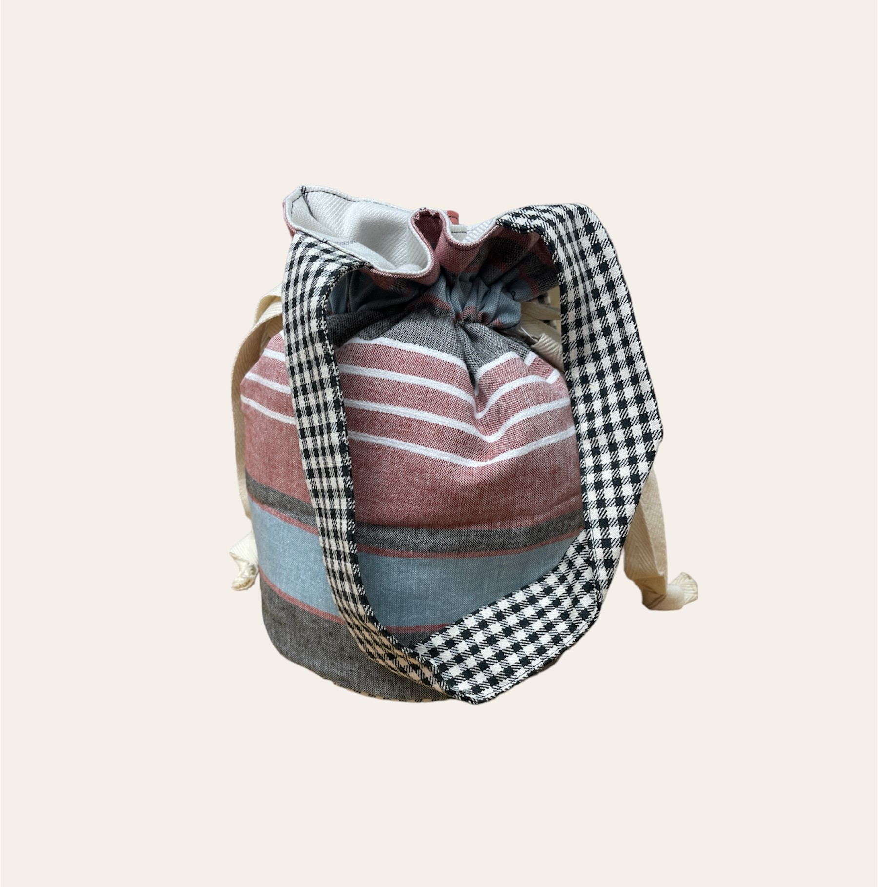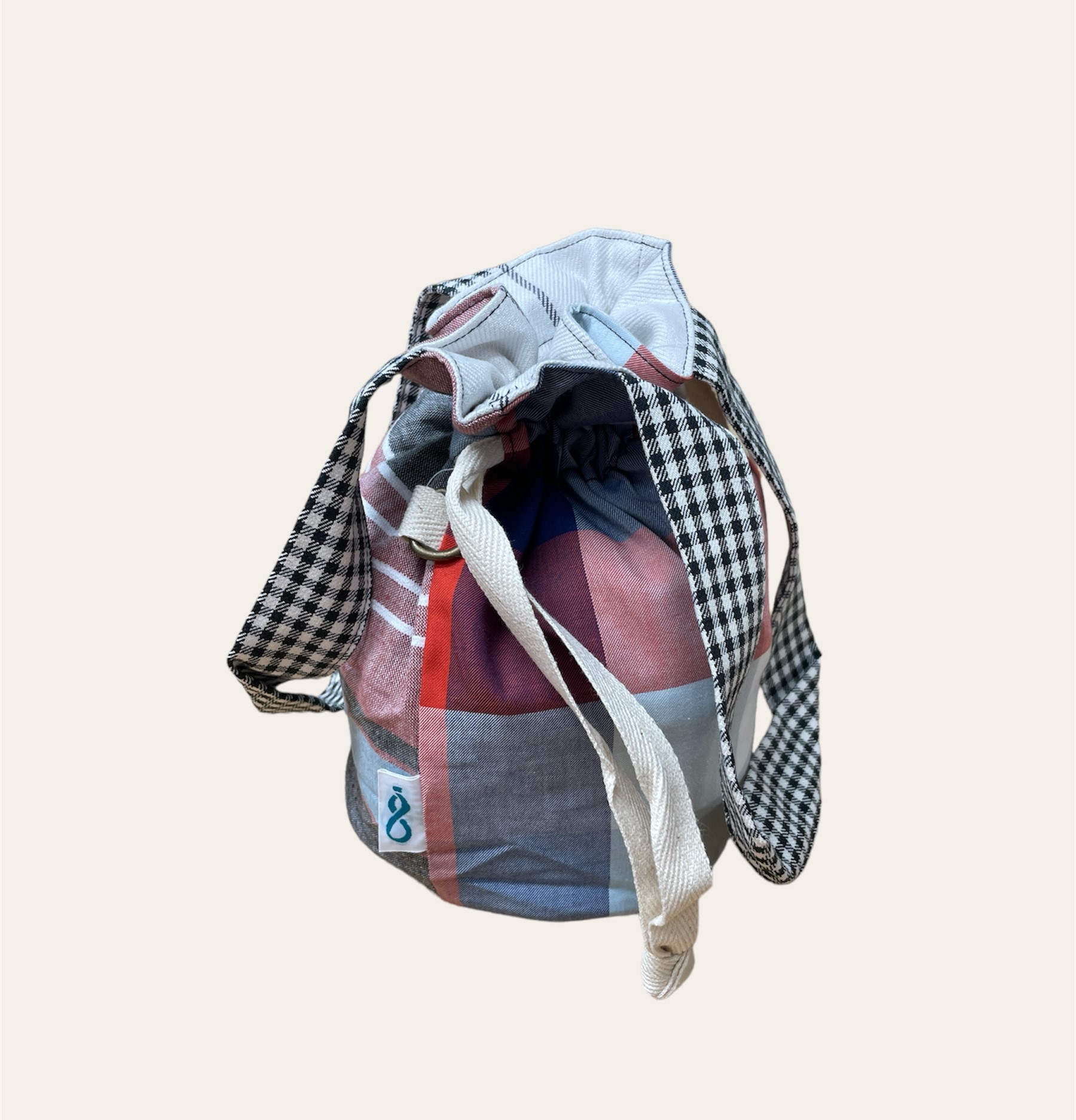 こちらの巾着は、表面の生地にレッド×ブルー系のブロックチェック柄、レッド系のボーダー柄。底面と持ち手はブラック×ホワイトの細かいチェック柄を使用。内面に白地にブラックのチェック柄を使用。