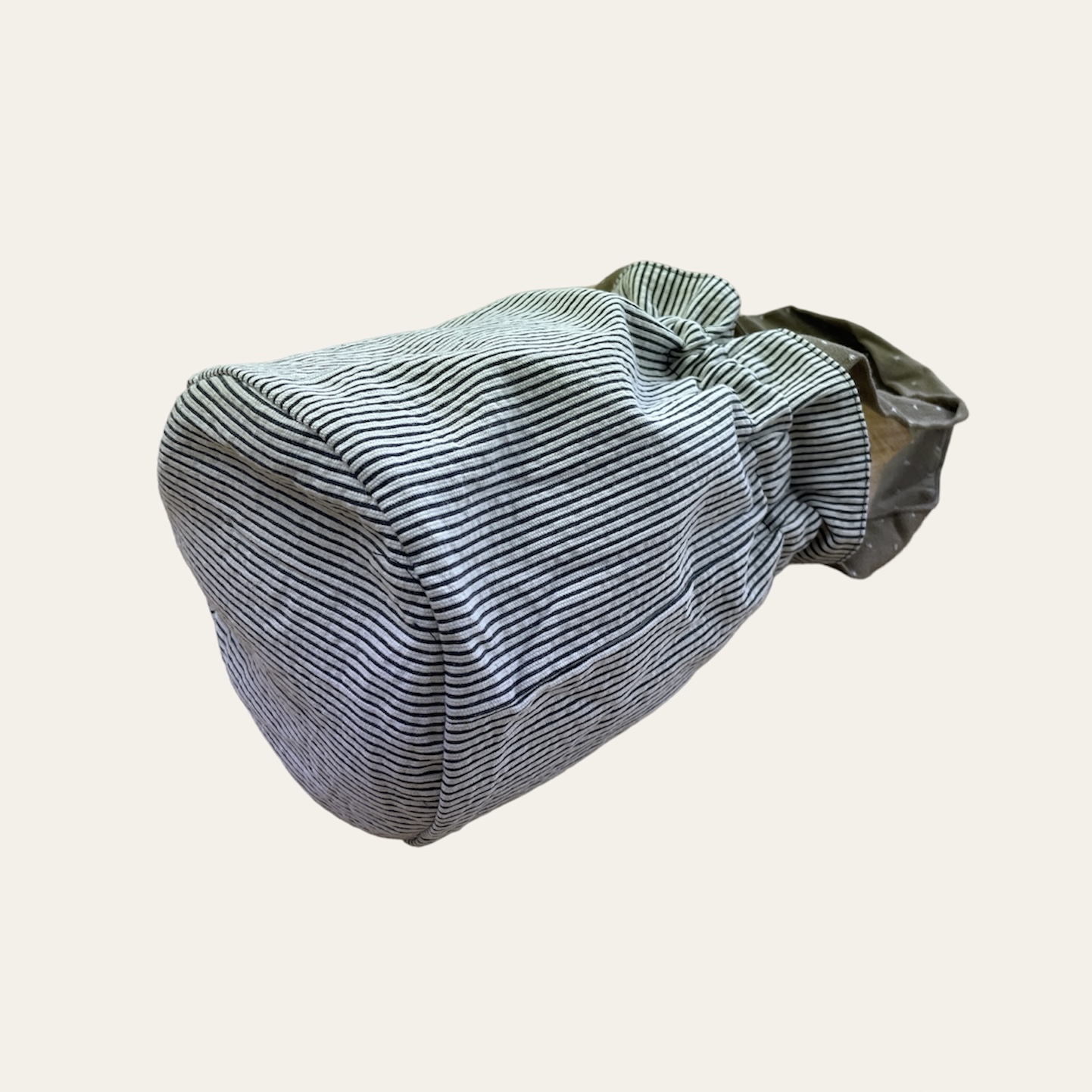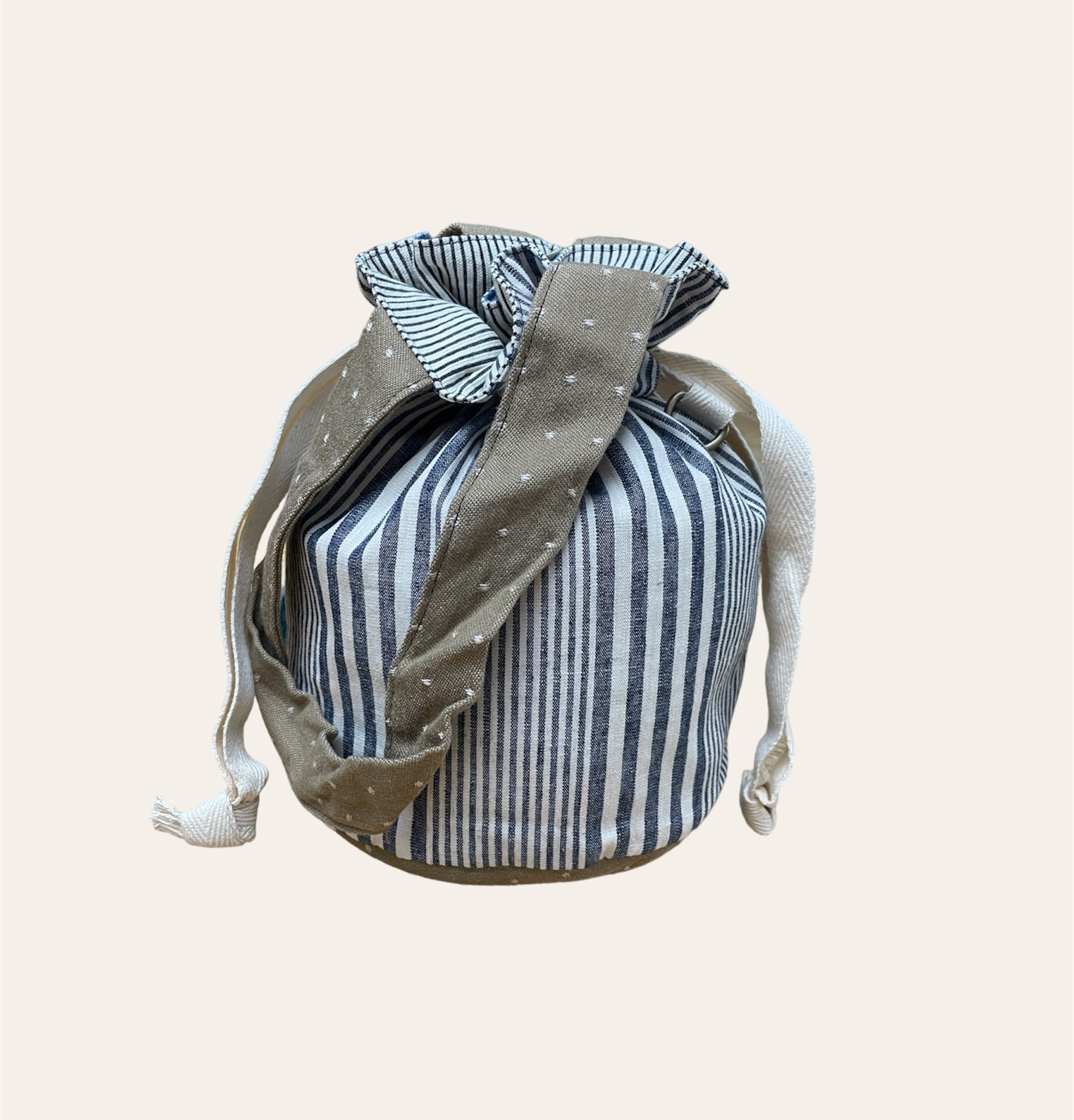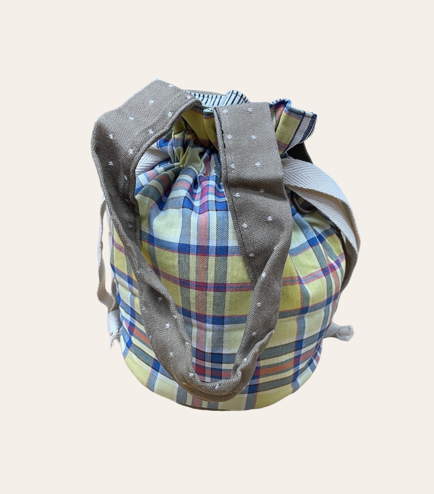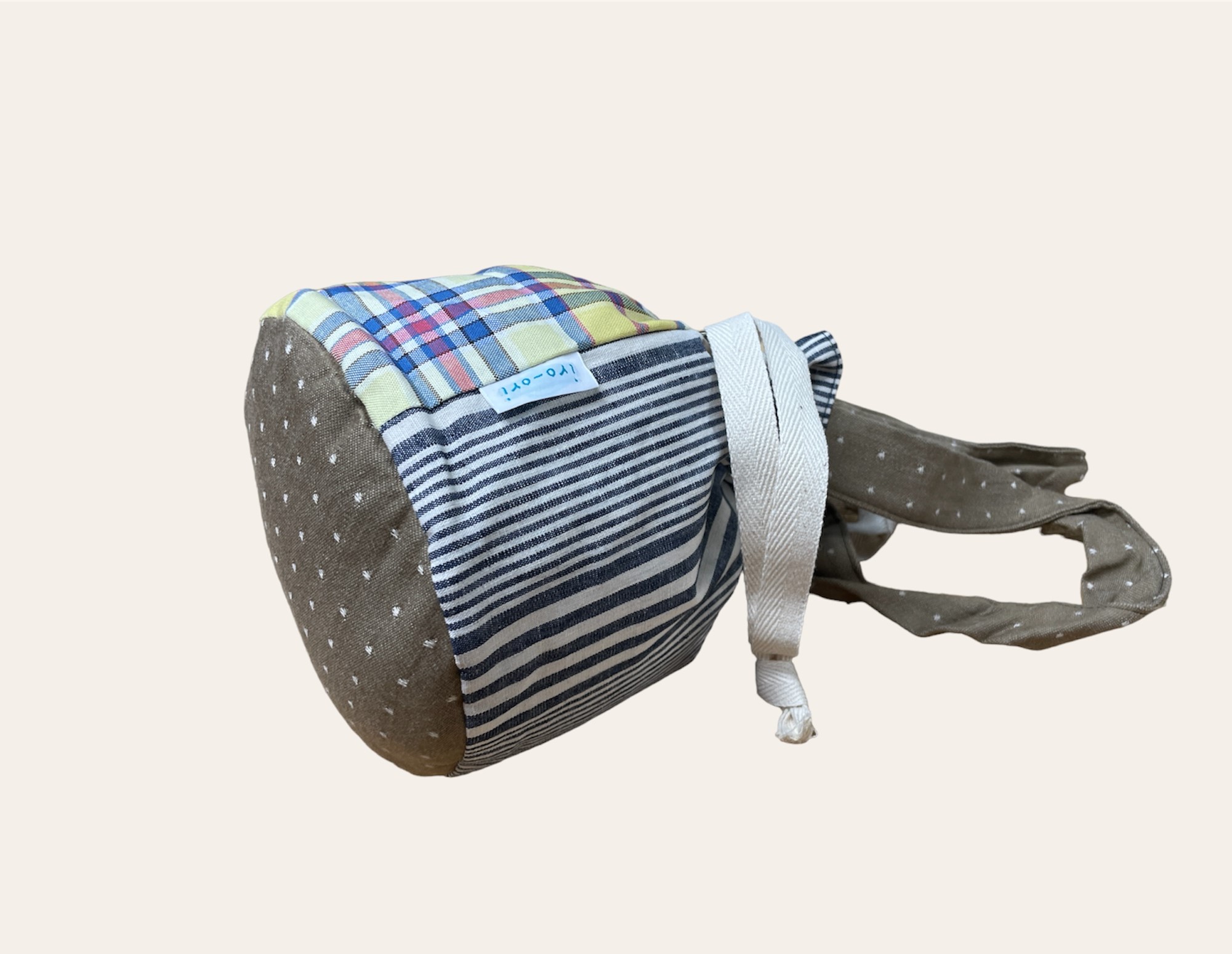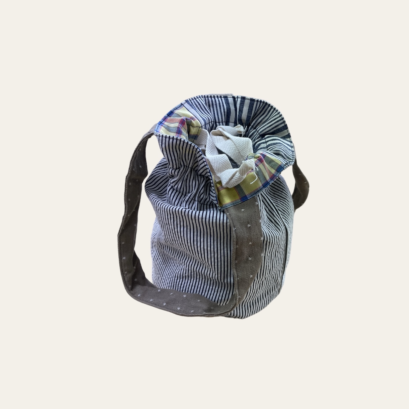 こちらの巾着は、表面の生地にイエロー地にブルー×レッドのチェック柄、生成×ネイビーのストライプ柄、底面と持ち手はベージュドット柄を使用。内面にホワイト×グレーの細めのストライプ柄を使用。