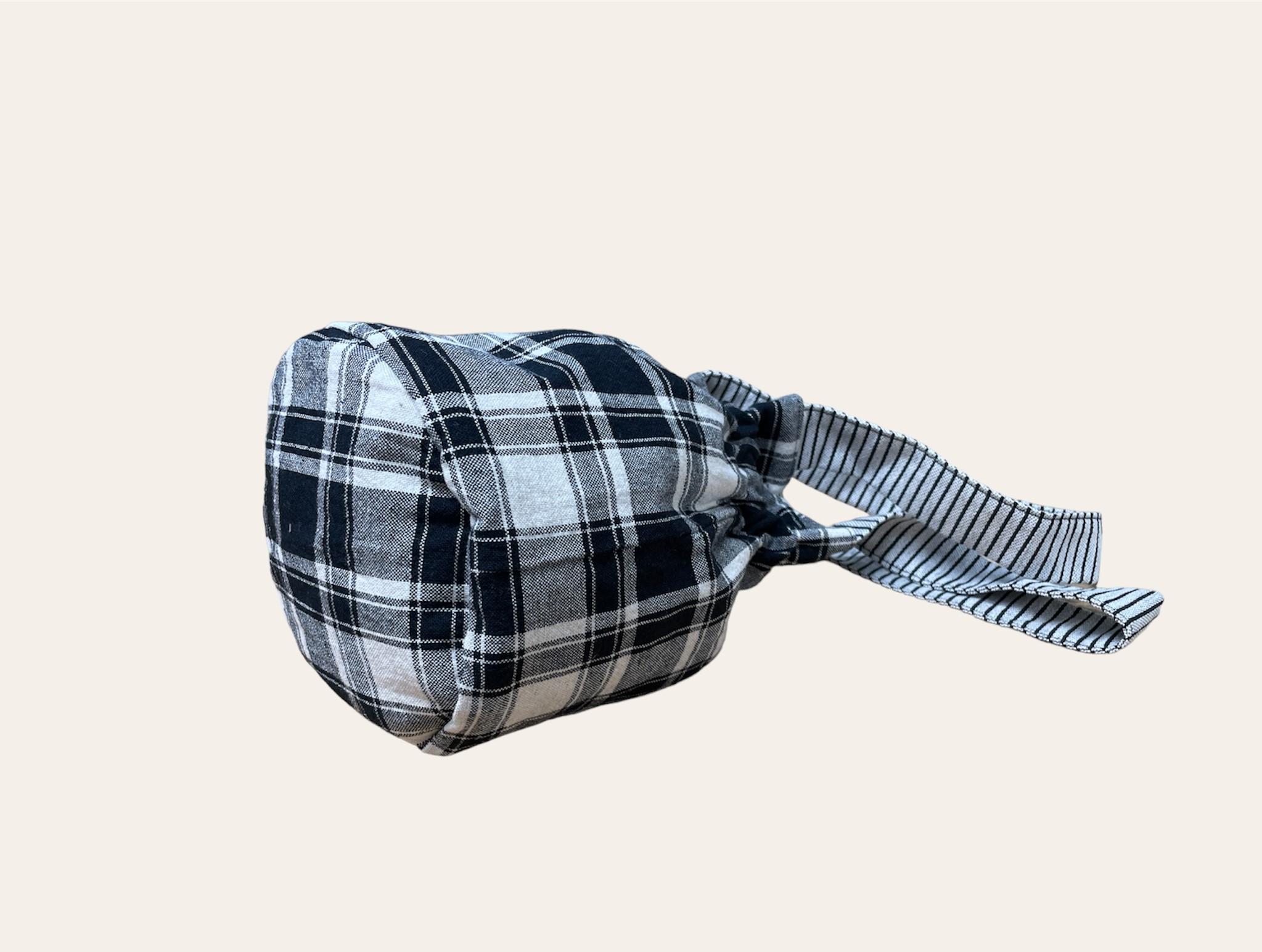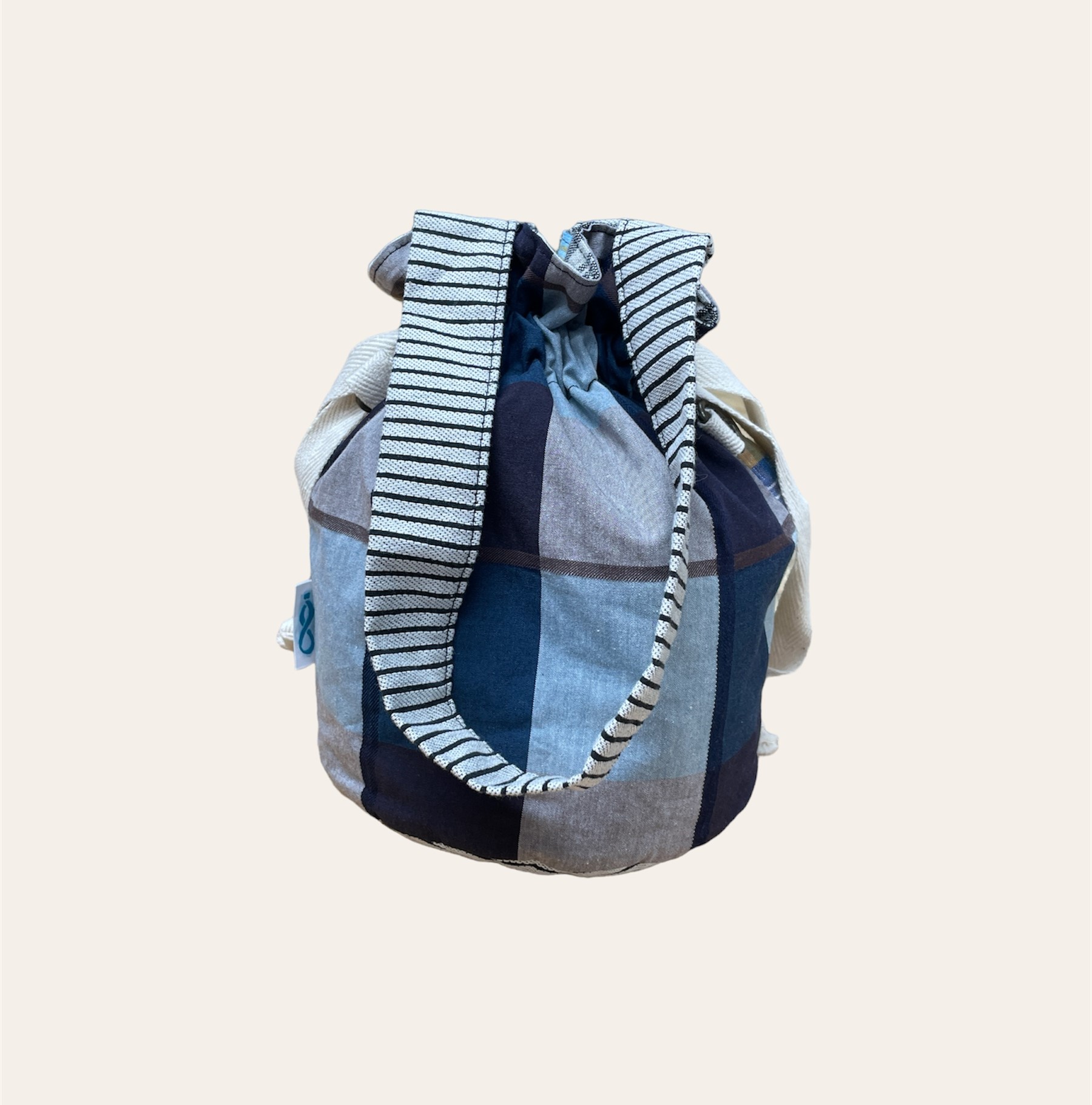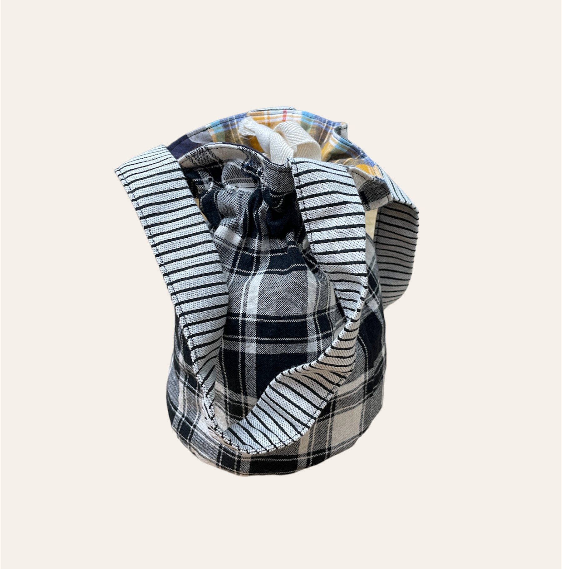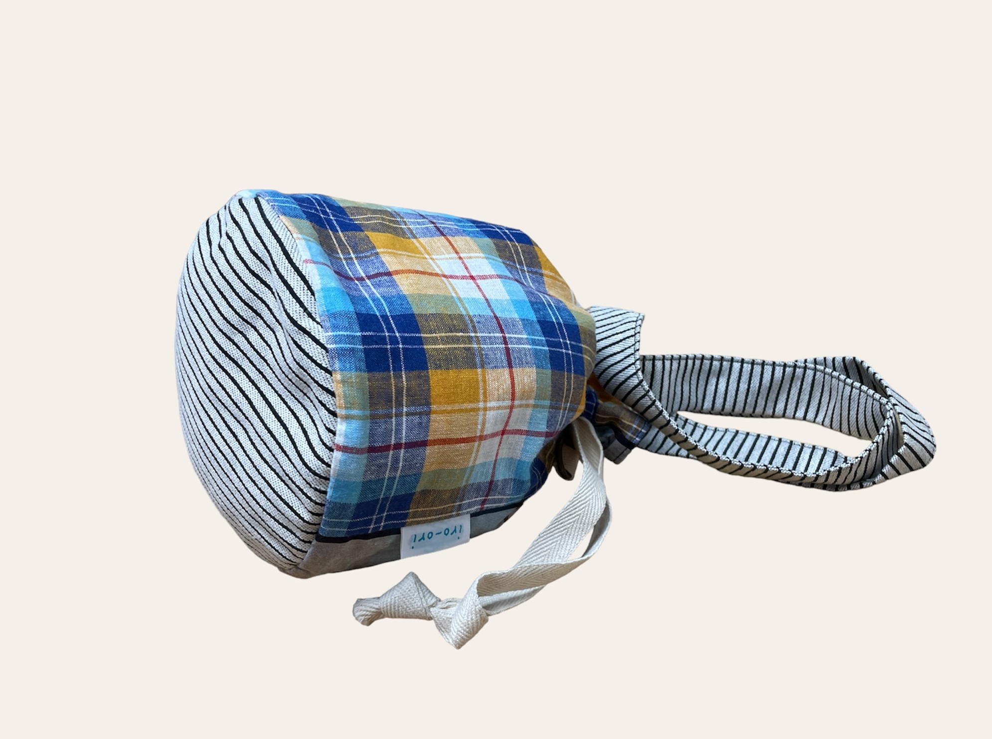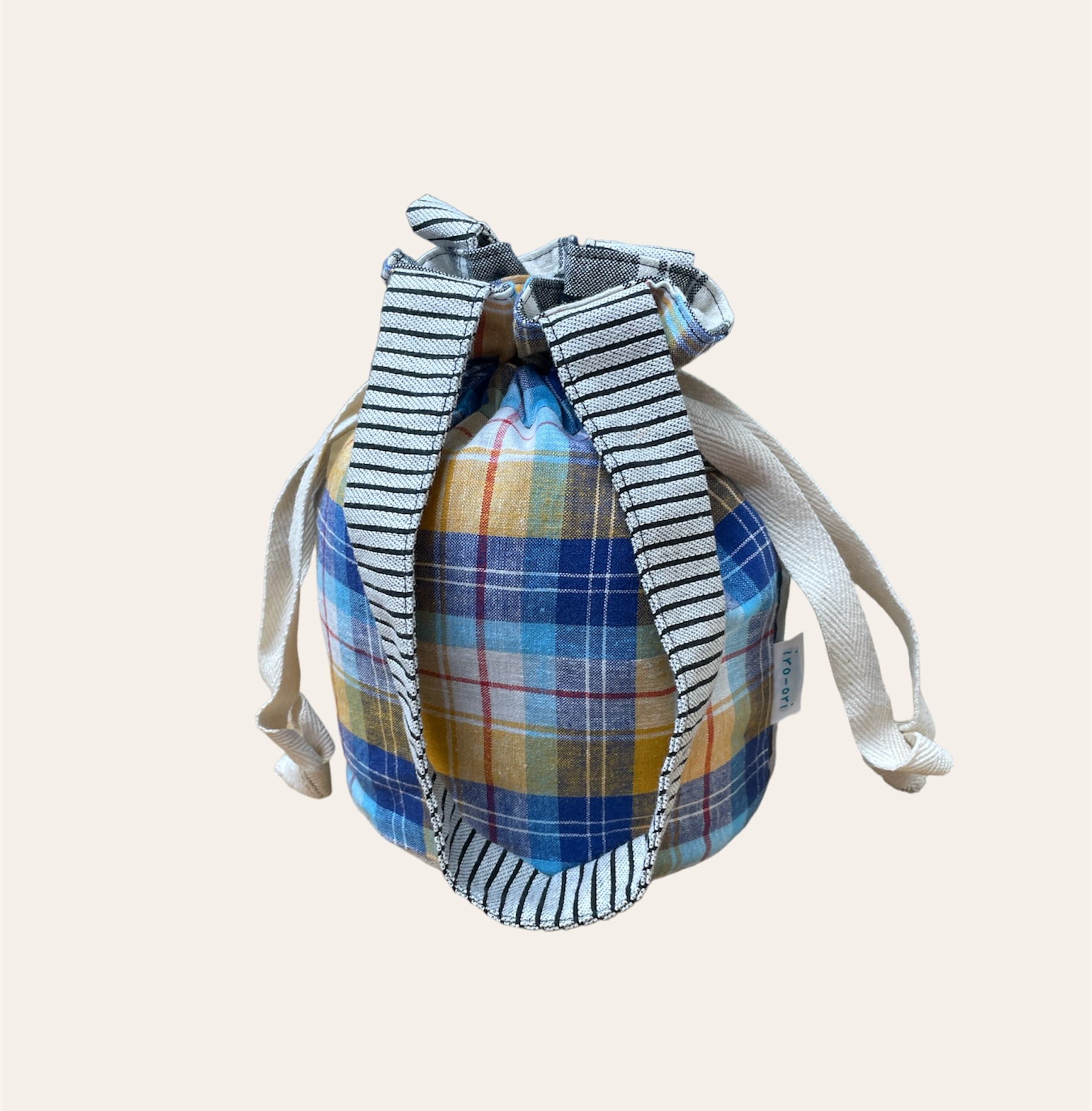 こちらの巾着は、表面の生地にイエローチェック柄、グリーンチェック柄、底面と持ち手は生成×グレーの細めのストライプ柄を使用。内面に生成×ブラックのチェック柄を使用。