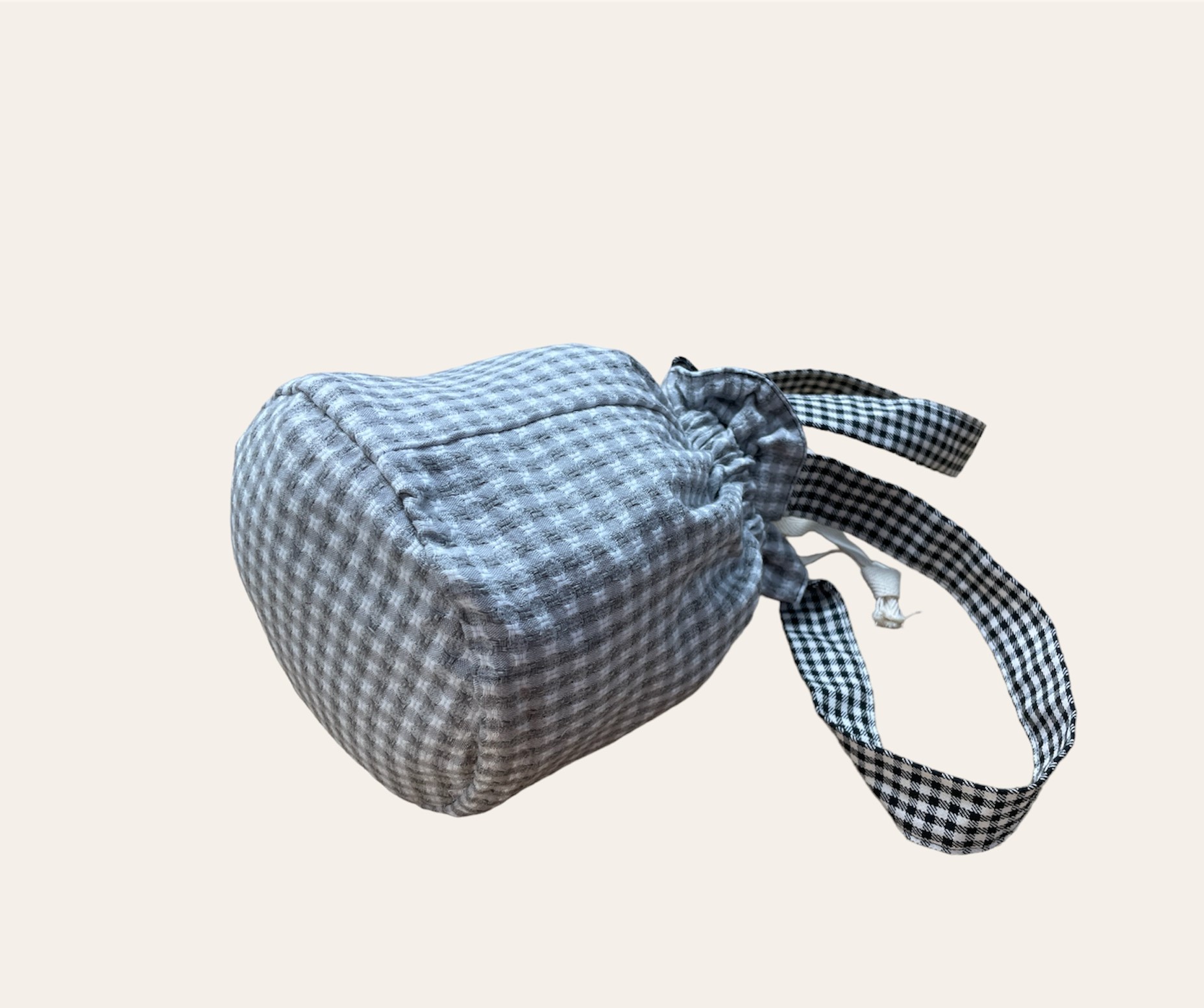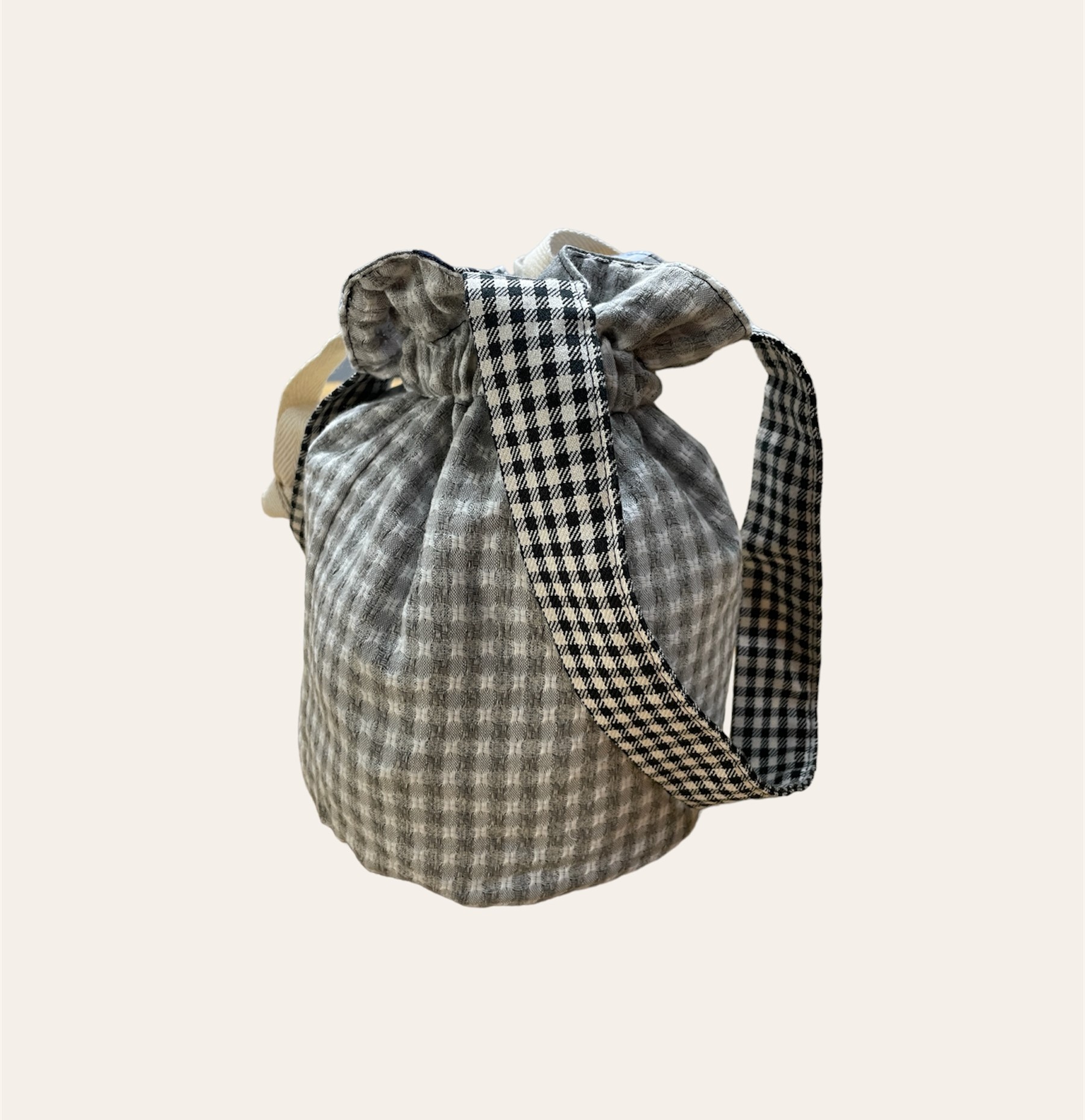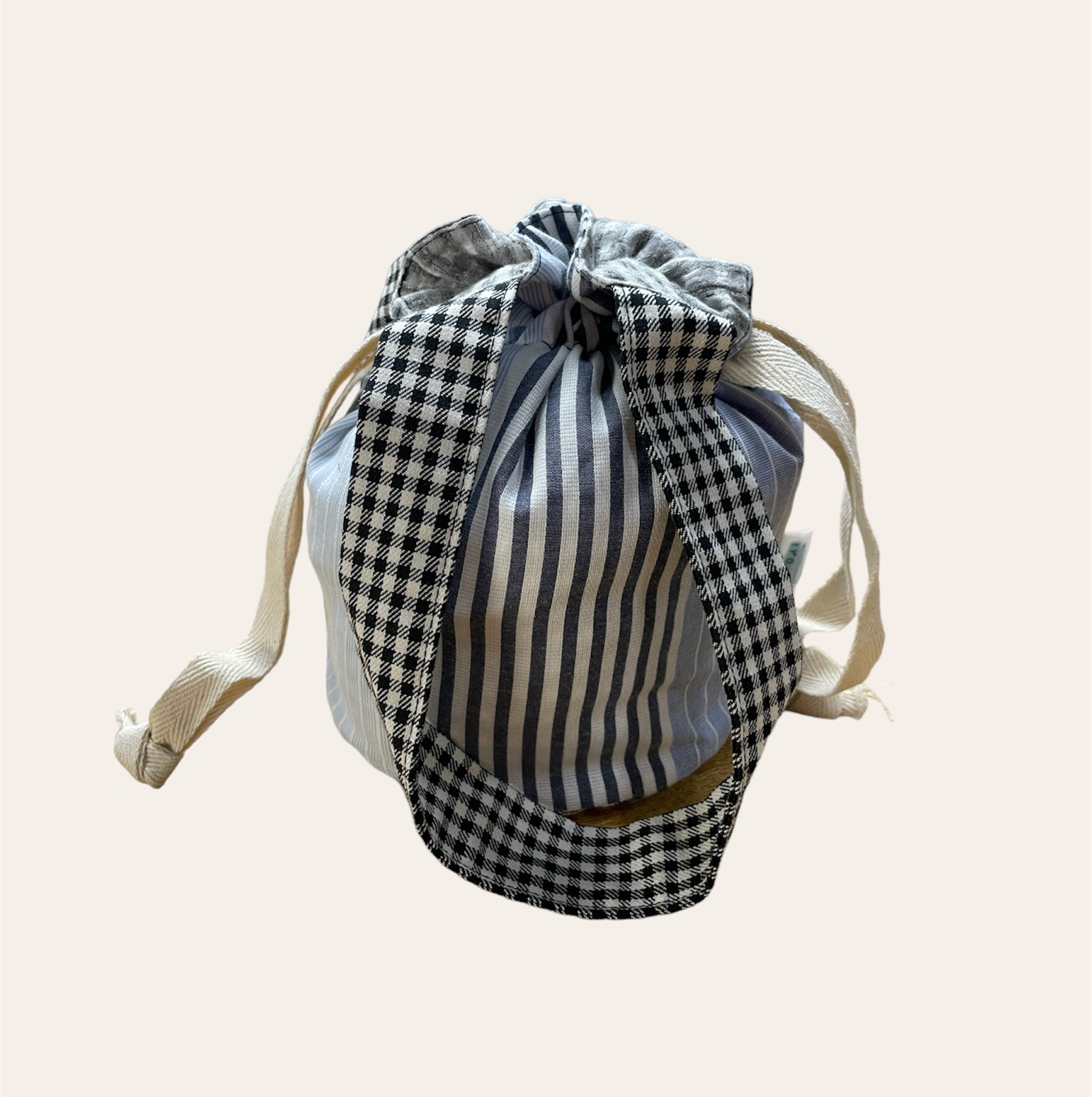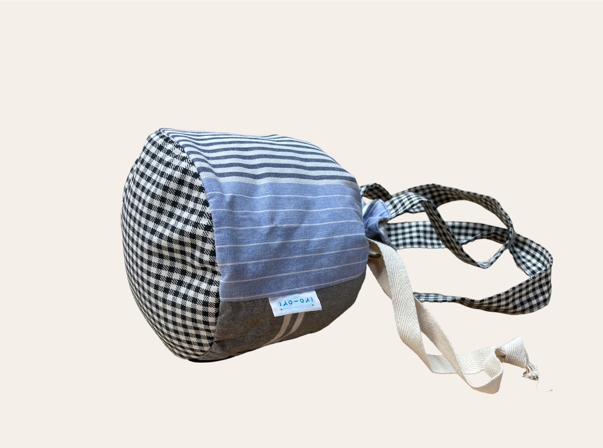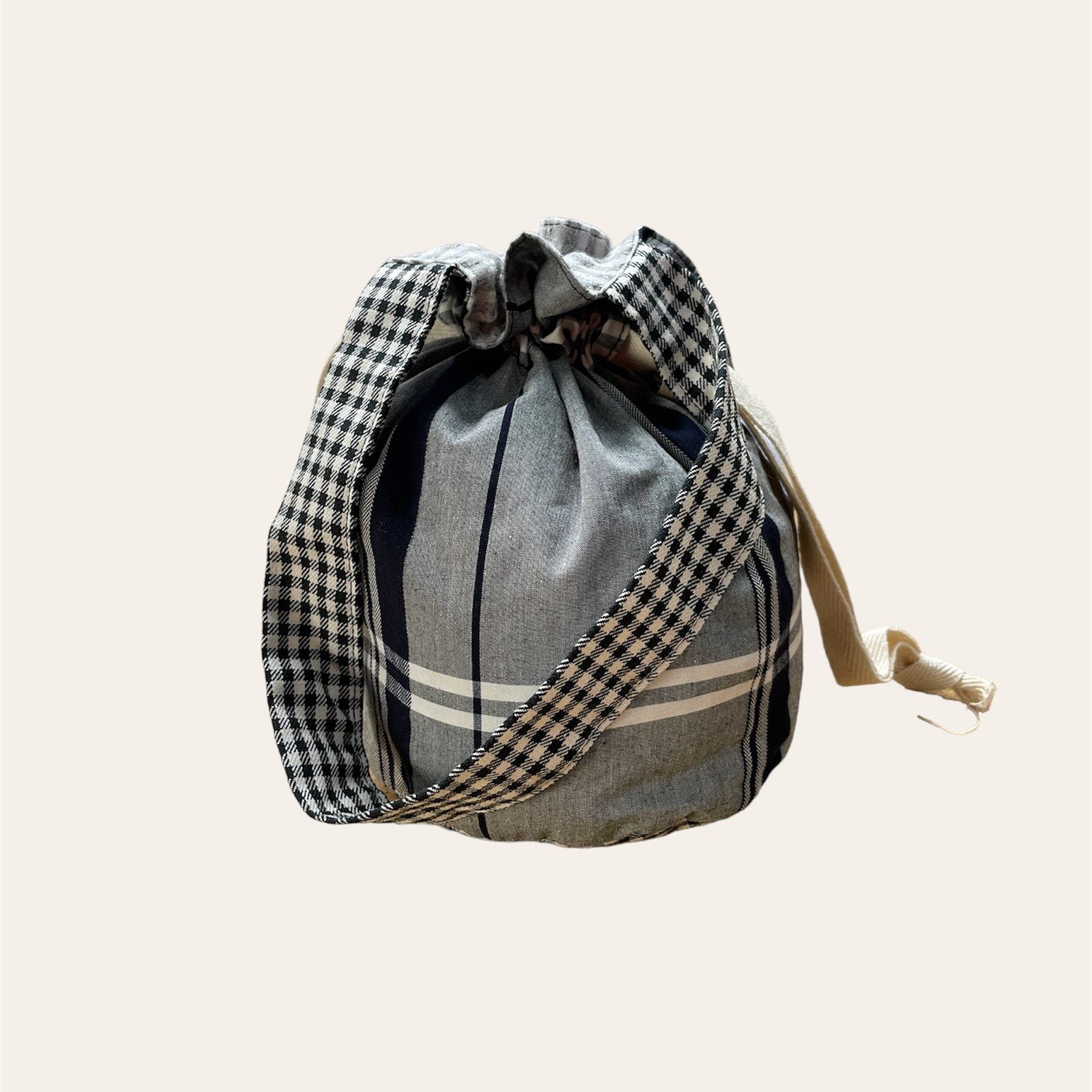 こちらの巾着は、表面の生地にネイビー×ブラック×ホワイトの大きめチェック柄、ライトブルー×ホワイト×ネイビーのストライプ柄。底面と持ち手はブラック×ホワイトの小さめチェック柄を使用。内面はグレー×ホワイトの小さめチェック柄を使用。