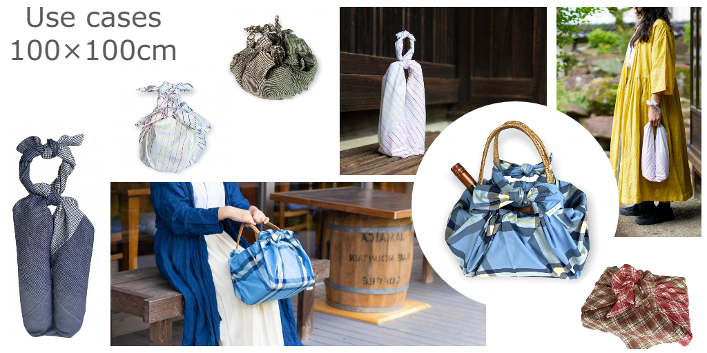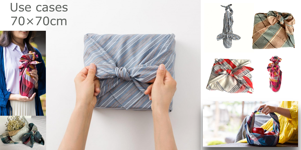 iro‐oriで現在お取り扱い中の 「播州織ふろしき」のサイズは3種類です。 用途、ご利用シーン、お使い頂く方に合わせて、サイズや柄選びをお楽しみください。
